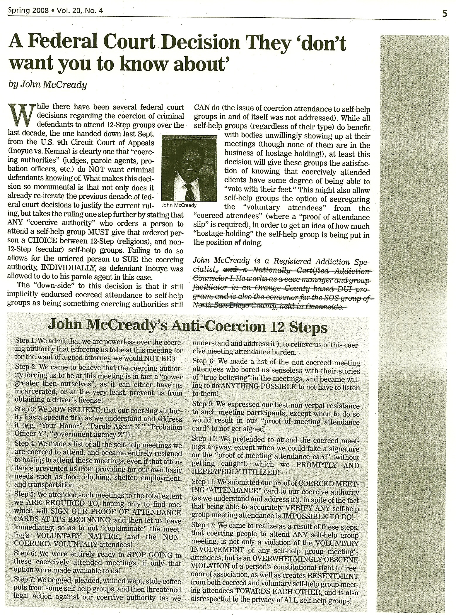 From: "John McC" Hi Orange, Can you please post the attached to the "OP-Forum" (I made reference to these "unedited" "Anti-Coercion, 12-Steps" in an earlier posting (now buried DEEP somewhere within it, since your forum has EXPLODED in postings, and members, etc!), and now have them to "post accordingly! Also, nauseating as it is-I would like to send you my copy of the AAWS produced "Hope" DVD (16:22-produced in 2009). I figured you could put it on either or both of the web-sites (with appropriate commentary of course! ;). I have shown the damn thing so many times in my DUI groups, its "skipping" now! (I am no longer going to show it, as I have a better DVD from Secular Organizations for Sobriety ("The Sobriety Priority") to show the clients. They already get enough 12-Step indoctrination by not having NON-local meetings to go to! Have a great day! John